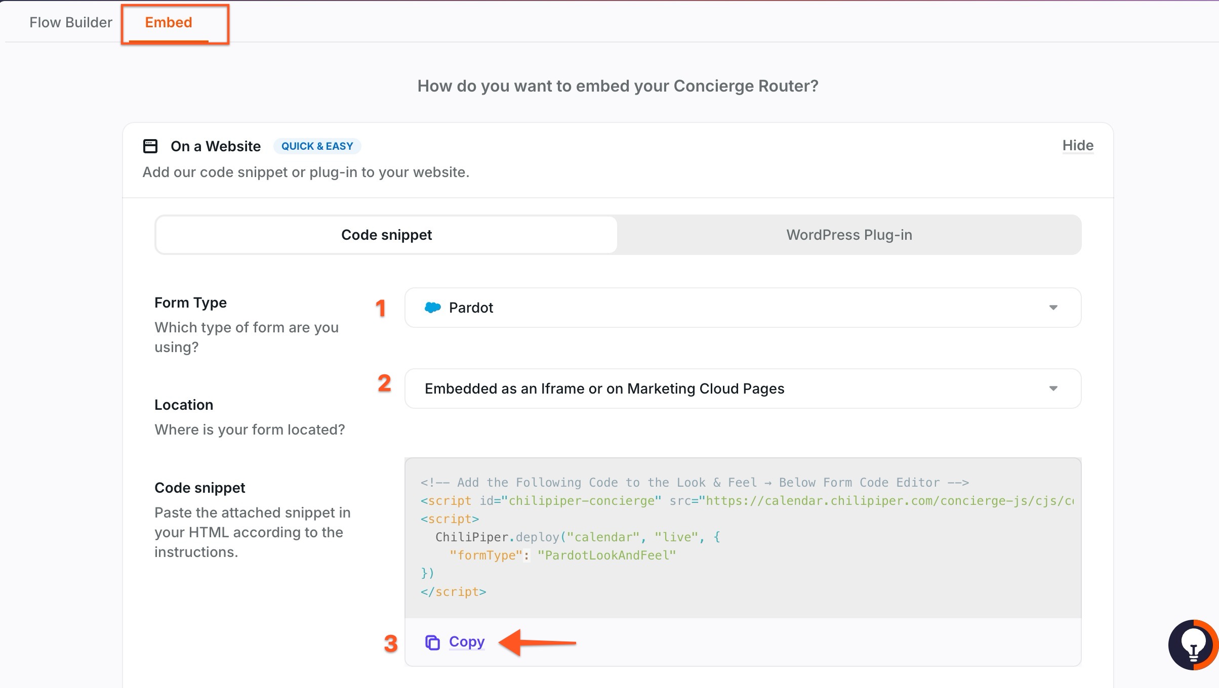 To get this code, go to your Concierge Router > Embed, then select the Form type as Pardot and Location as Embed as an iframe or on Marketing Cloud Pages, and copy the code in the first Code Snippet's section.