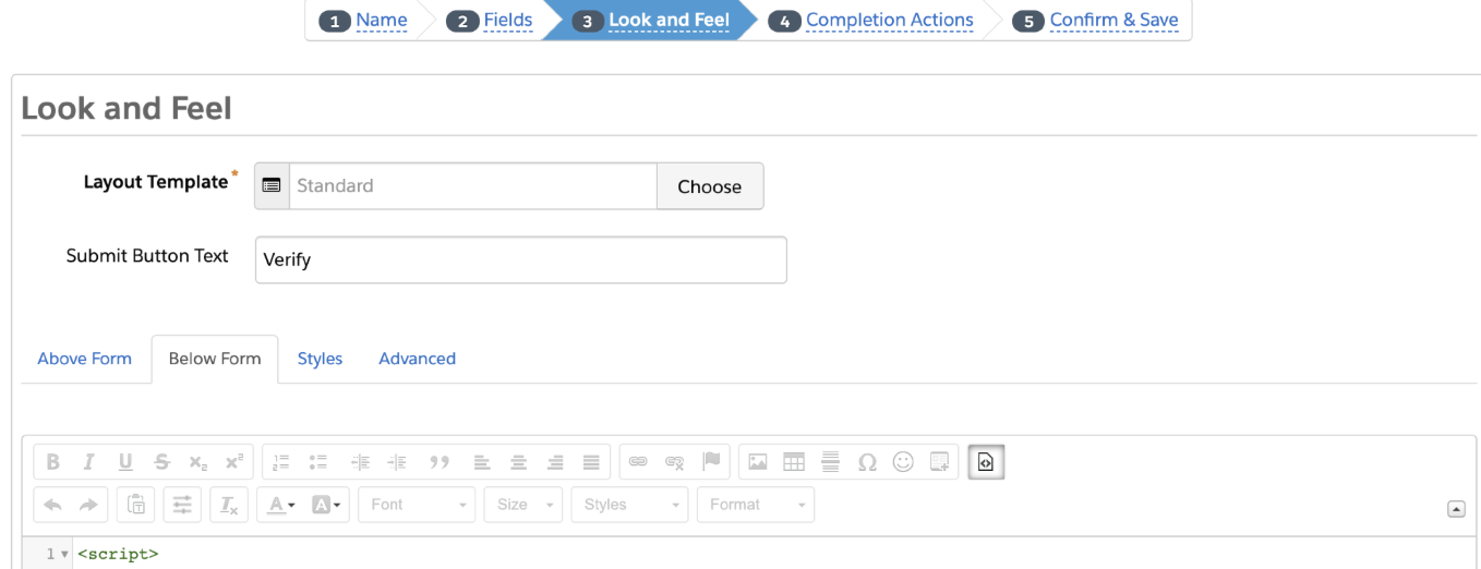 In Pardot, navigate to your form, under "Look and Feel" open the "Below Form" Source code, and add the script below.