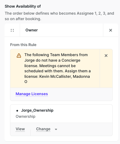 All Team Members or Individuals you have assigned on this path must have a Concierge license assigned to them. Otherwise, if any prospects match to an unlicensed user, they will not be able to book a meeting and route to the Not Scheduled path.If you notice any in-app warnings, as the example below, state that one or more users are unlicensed, please manage user licenses in the Admin Center.
