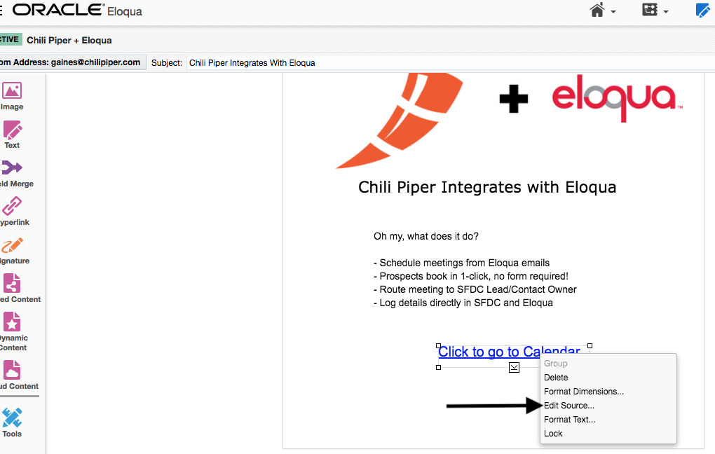 Next, open up an Oracle Eloqua email and make sure the email is within the Email Group you have created. Assuming you've built the email and added a Hyperlink, we'll want to right-click on the Hyperlink and edit the source code similar to the picture below: