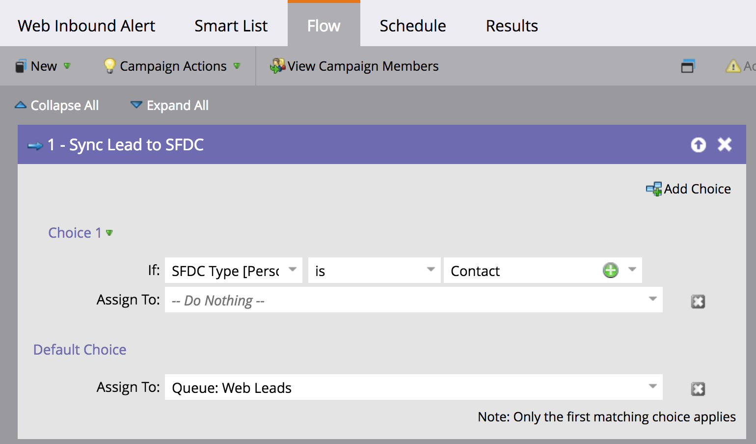 Add Flow Step: Sync to SFDC (create a lead in SFDC if it doesn’t already exist) - We have the first choice to handle existing Contacts. Marketo won’t create a duplicate Lead if one already exists.
