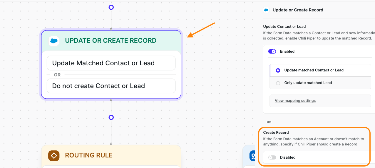To prevent Chili Piper from creating a duplicate Lead in SFDC, you must disable Record creation by Chili Piper in your Concierge Router's Flow Builder, specifically within the Create or Update Record node: