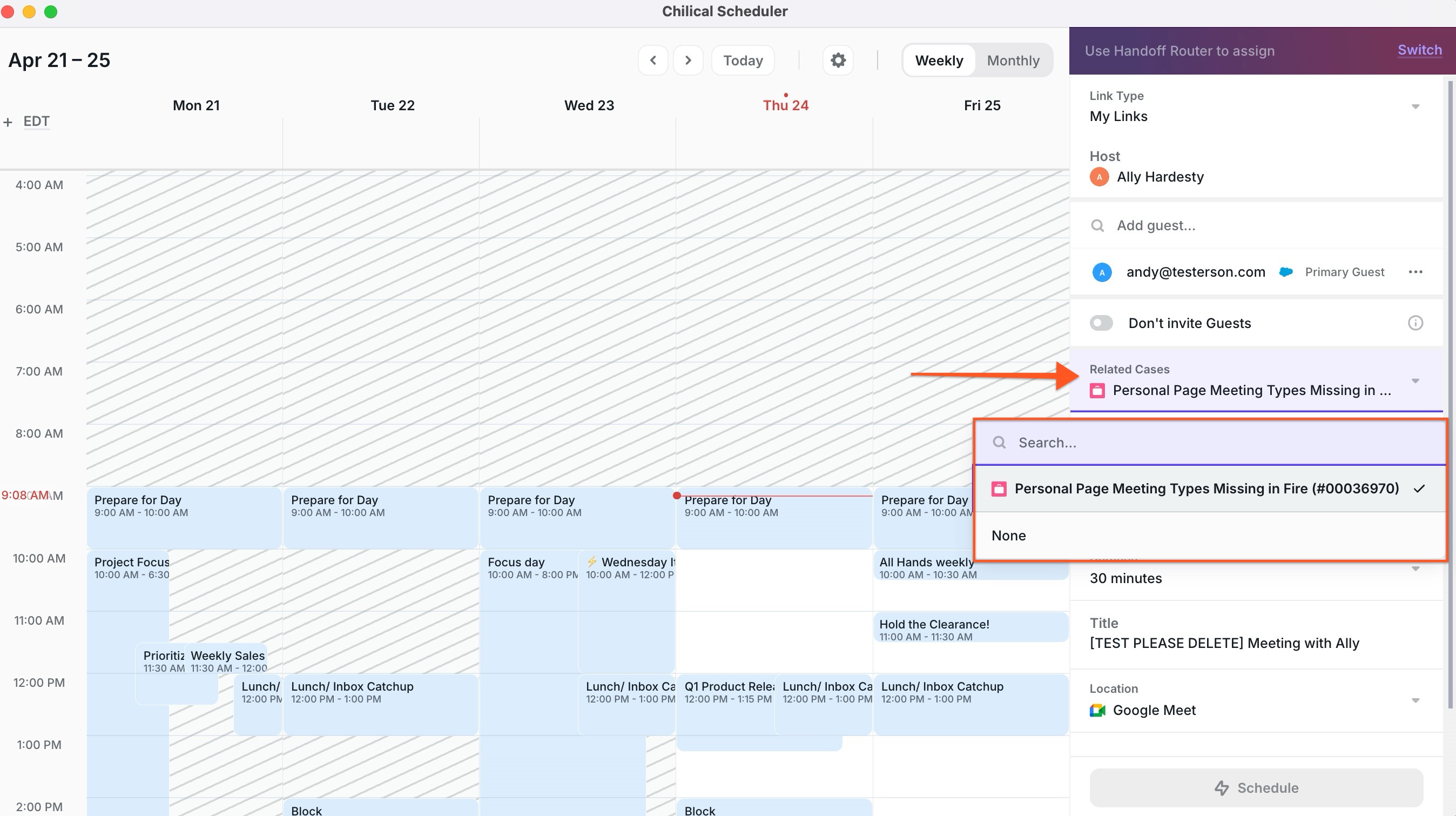 In this use case, you can send a customer a personalized Scheduling link for your specific Case so that when the client books a meeting, the meeting is related to the Case.