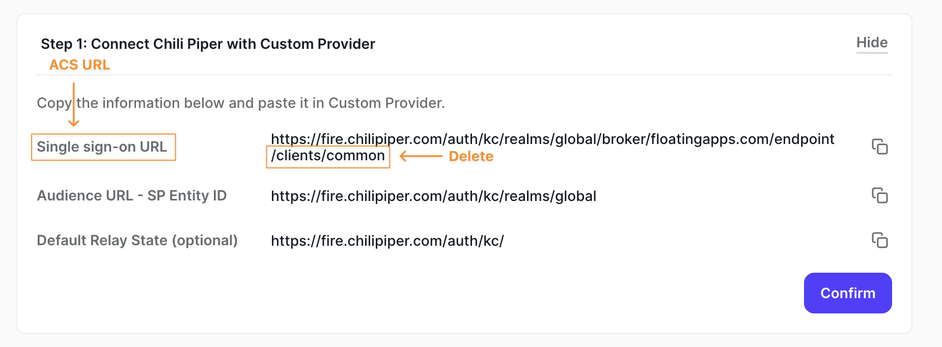 - Please note that the Single Sign-On URL field in Chili Piper is the same as the ACS URL field in Google: