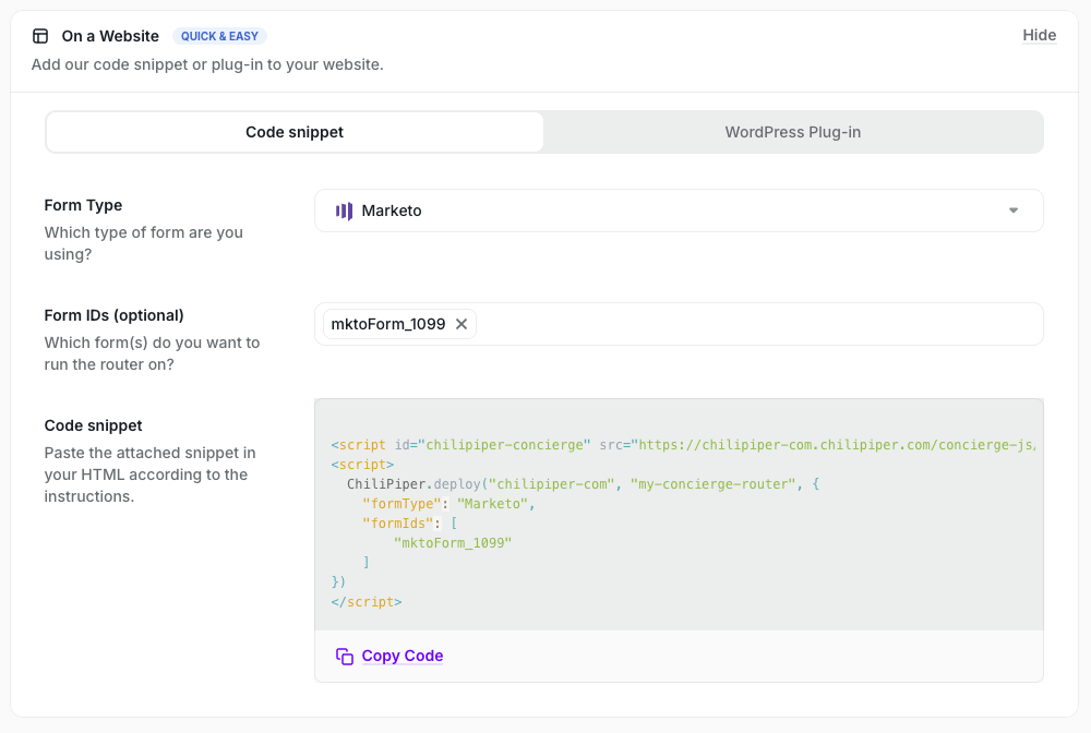 Chili Piper integrates seamlessly with Marketo forms, allowing you to trigger scheduling directly after a form submission. The most common and recommended method is to use the standard Concierge snippet. This is the approach almost all customers should start with.