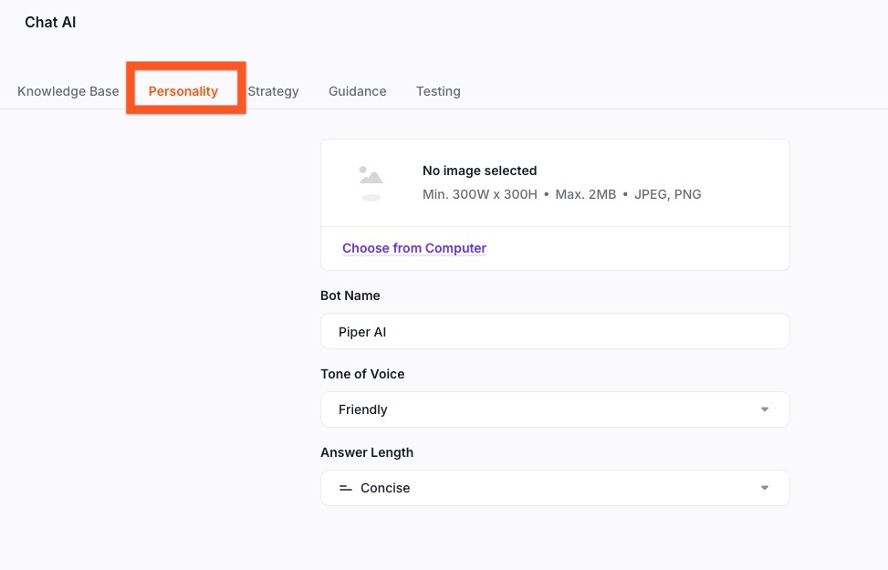 This is where you bring Chat AI to life. In the Personality tab, you can: