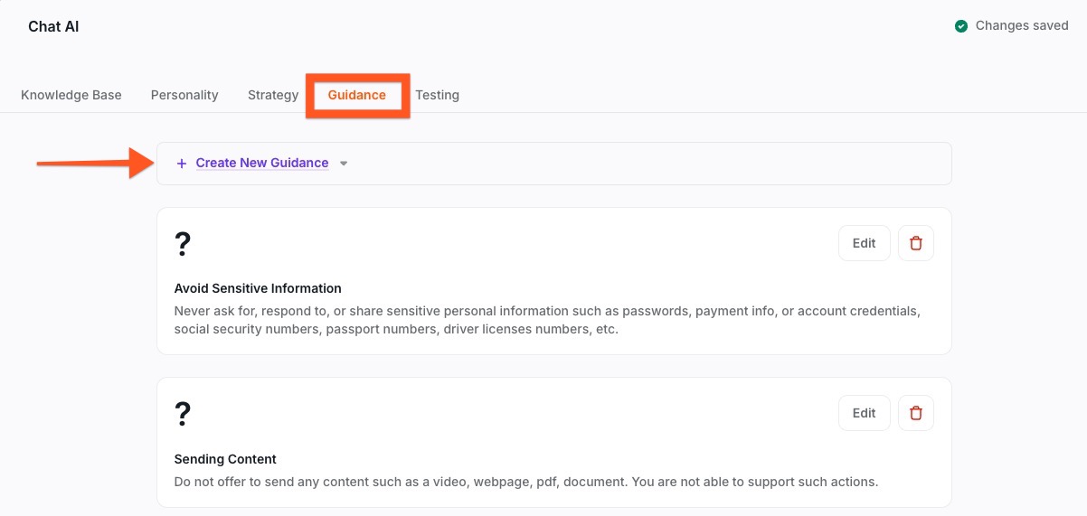 Guidances are playbooks for how Chat AI should handle sensitive or nuanced situations. They give you control over: