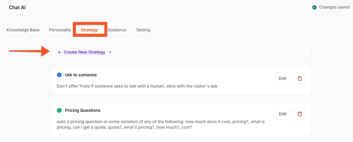 Strategies define what Chat AI should look out for during conversations. Think of them as high-level intents, such as: