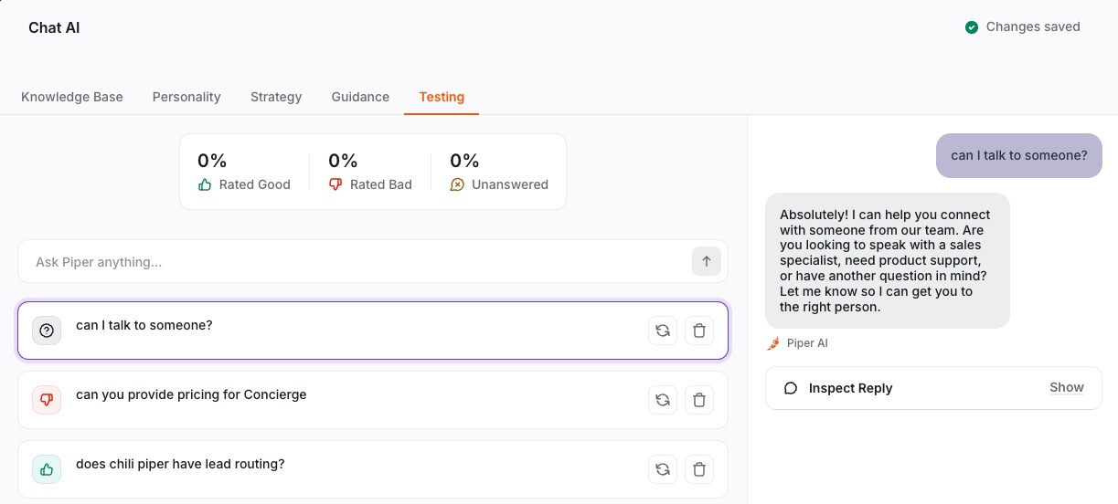 Before going live, use the Testing tab to see how Chat AI responds in practice. You can: