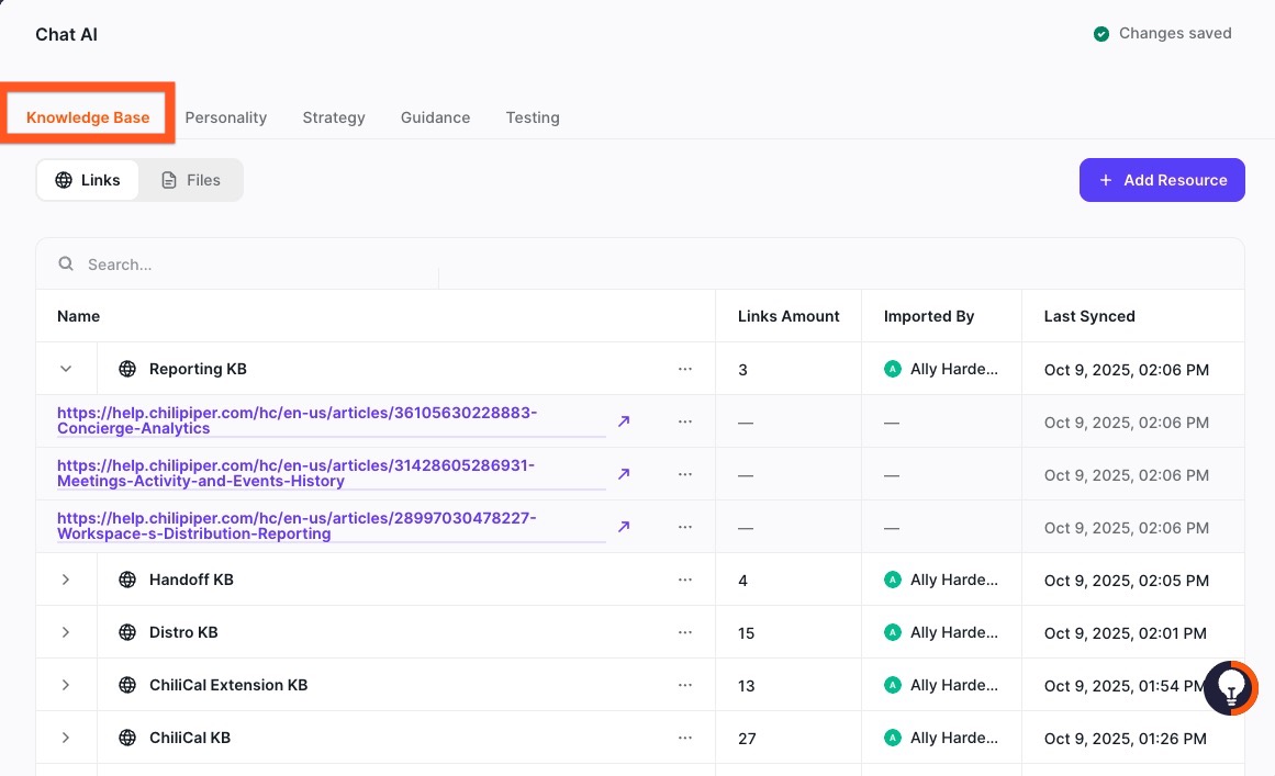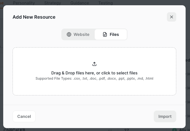 The Knowledge Base is Chat AI’s memory. This is where you load the content that will be used to respond accurately to visitor questions. You can: