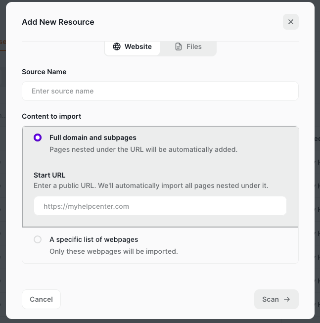 - Add URLs from your website, so the AI can pull directly from live pages.