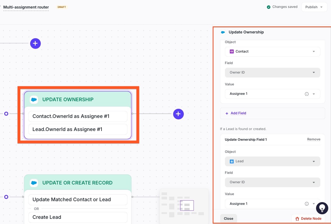 3. In CRM nodes, use Update Ownership to update fields for each assignee. They will be added in the order of the distributions you add - Assignee 1, Assignee 2, Assignee 3, and so on.