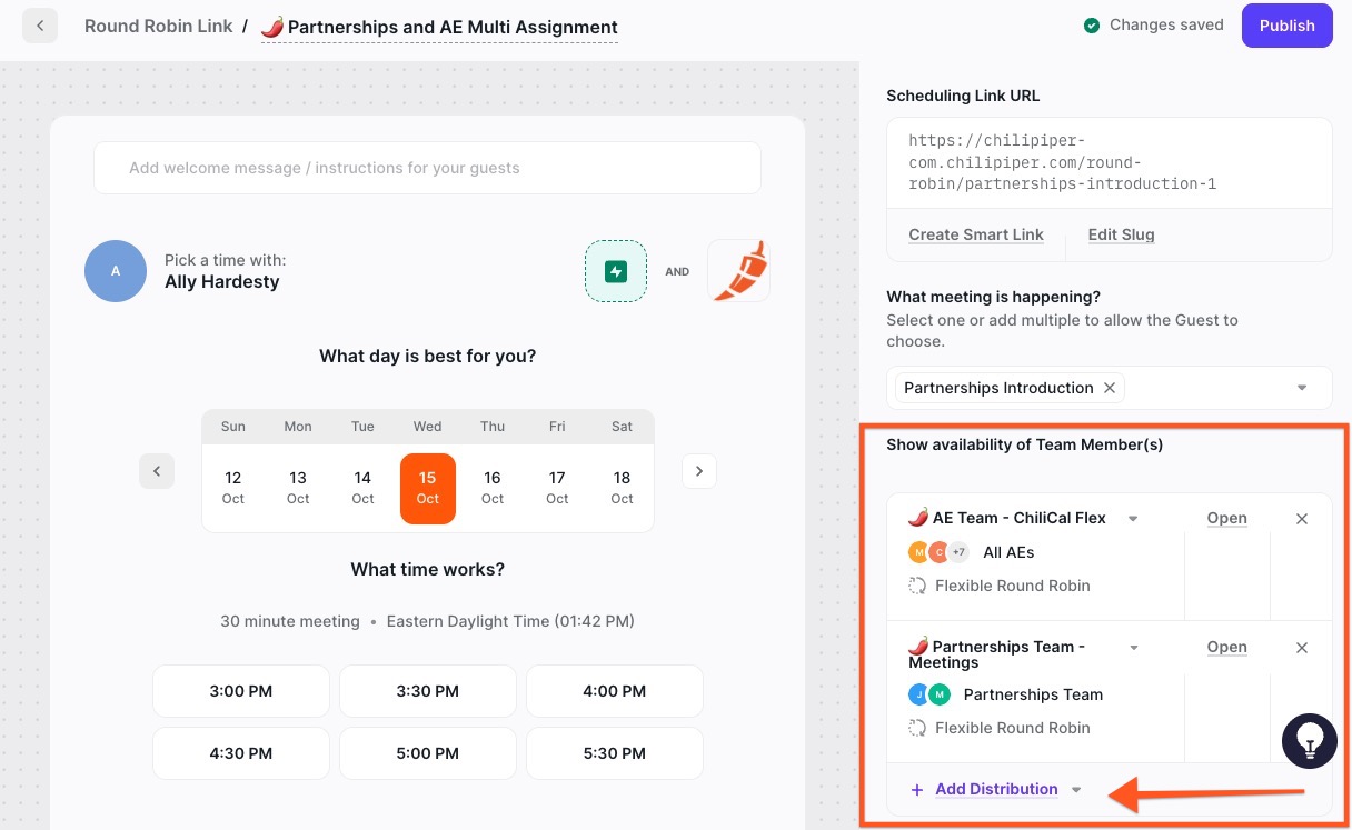 - Create a scheduling link with multiple Round Robin Distributions. To do this, simply add additional distributions under 'Show availability of Team Member(s)'.