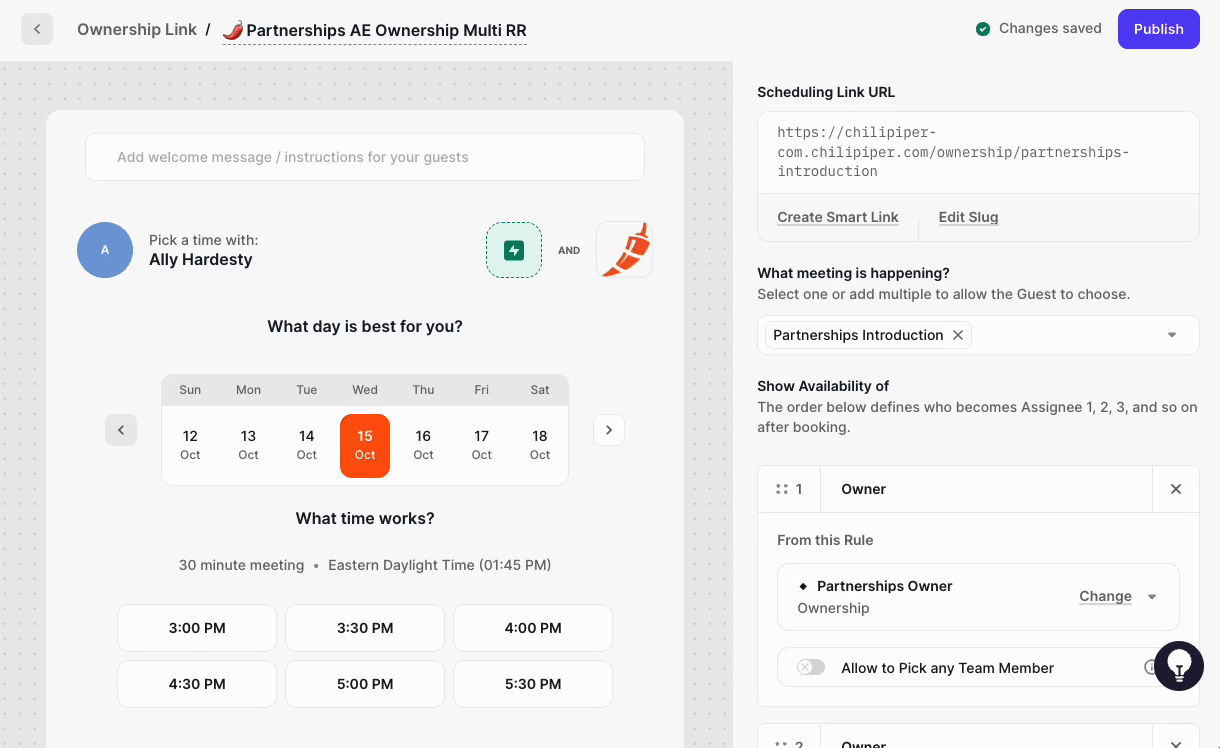 - Create a scheduling link with multiple Ownership Rules (e.g., Account Owner + CSM Owner). To do this, simply add additional distributions under 'Show availability of Team Member(s)'.