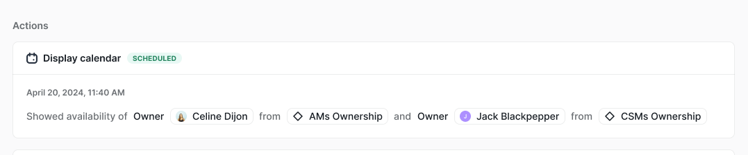 If multiple types of Distributions or individuals are added, you will be able to see all the details of who was assigned and whose calendar was displayed in the Display Calendar action.