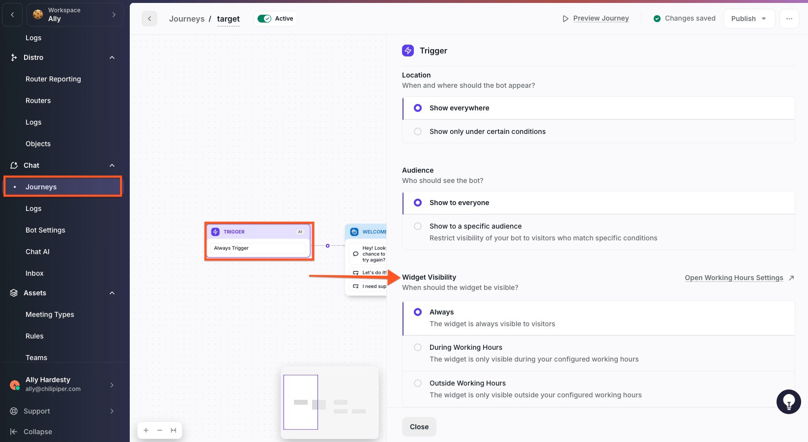 Once you have set your Office Hours in Bot Settings, you can decide which Journeys should be triggered during Office Hours or Outside Office Hours.