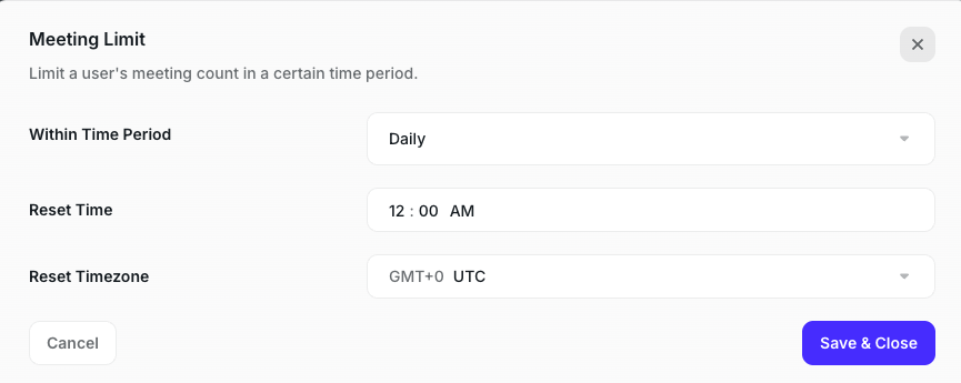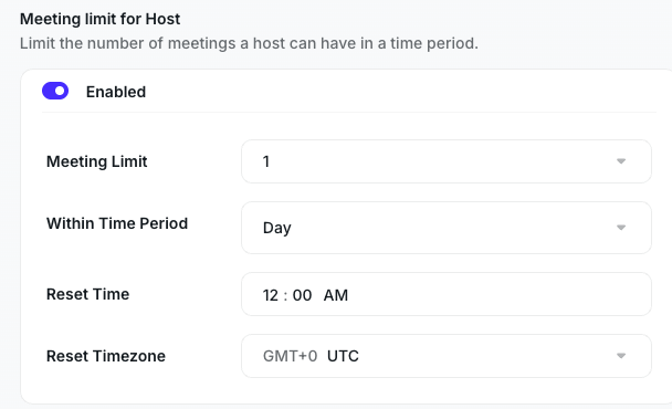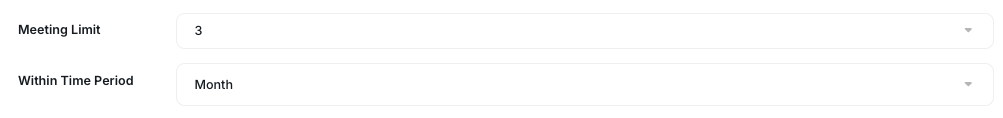 You can set the Meeting Limit (number) within one specific Time Period (Day, Week, Month, Custom).