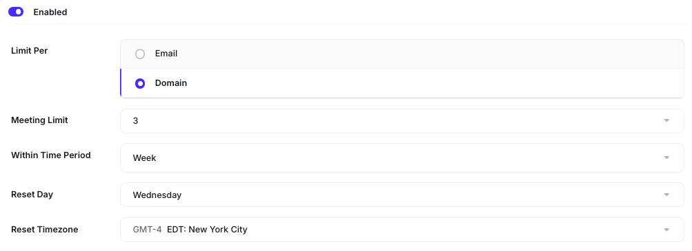 For the example below, we set a weekly Limit of three meetings per domain. The Limit will reset every Wednesday at midnight EST. This means that users with @acme.com (hypothetical domain) can book only three meetings from Wednesday to Wednesday.