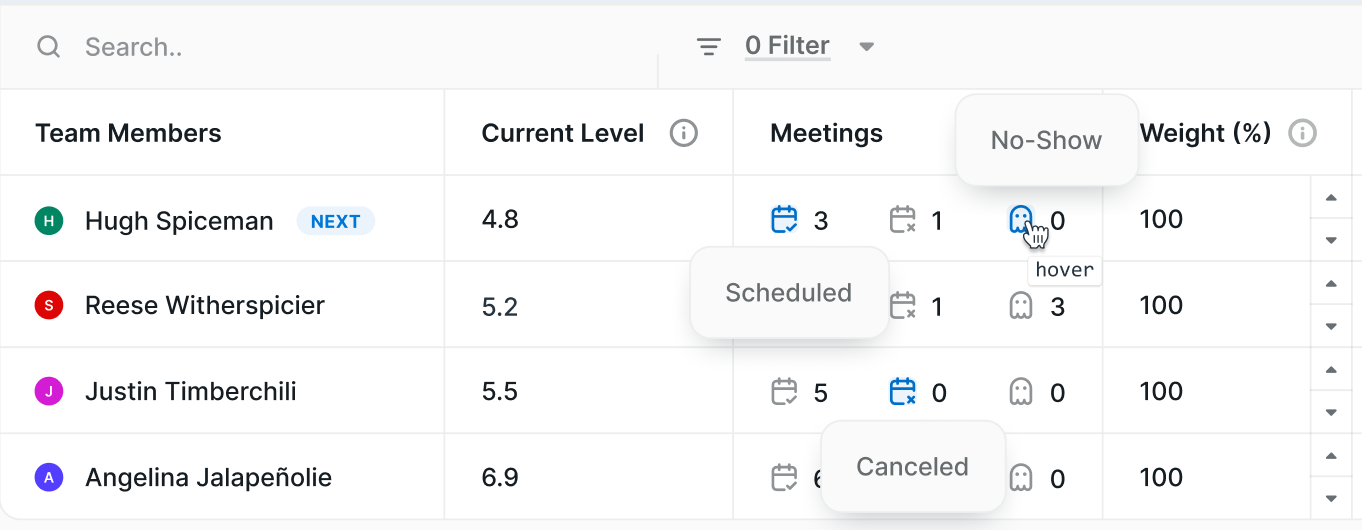 We're planning to surface more details on this page – reassignments in/out, vacation calibration, and mid-cycle calibration adjustments. The column will also be renamed from "Meetings Scheduled" to just Meetings, with inline indicators for scheduled/held, cancelled, and no-show – all visible at a glance within a single column. See the screenshot below for a sneak peek.