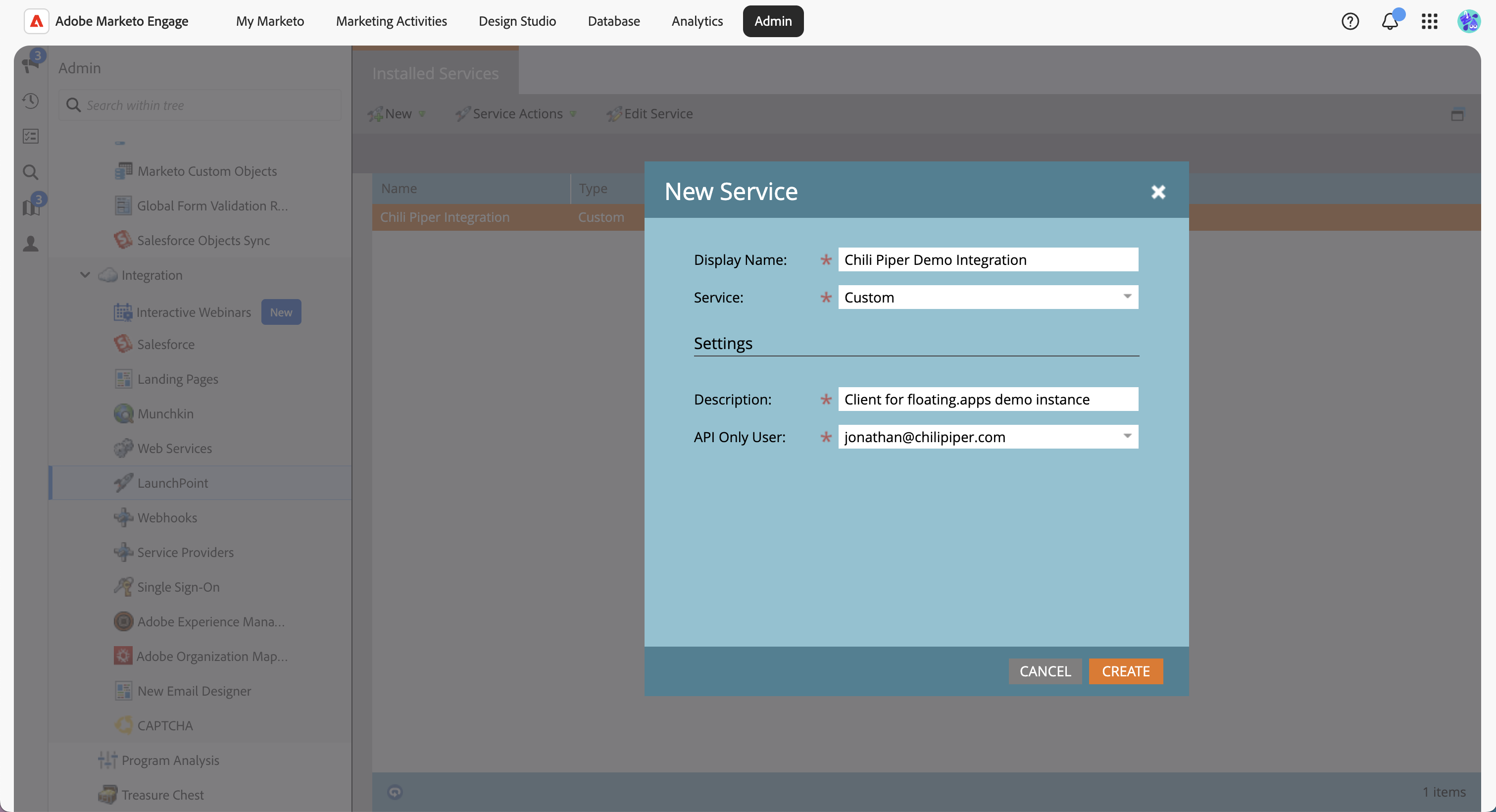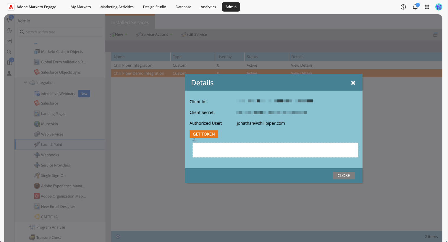 - In Marketo, go to Admin > Integration > LaunchPoint.