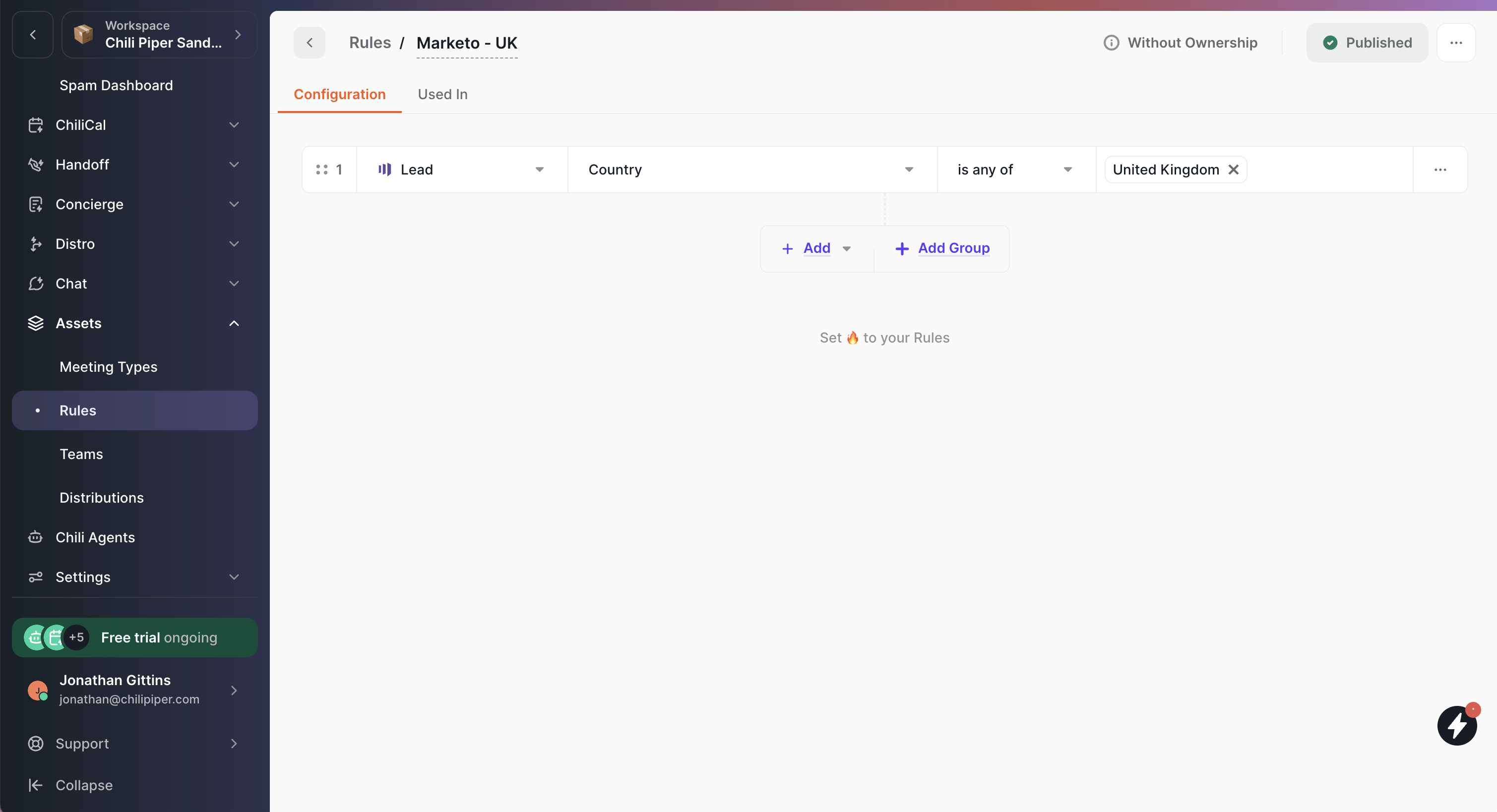 In Marketo, this activity appears with the filter name New Chili Piper Chat Started and the trigger name New Chili Piper Chat.
