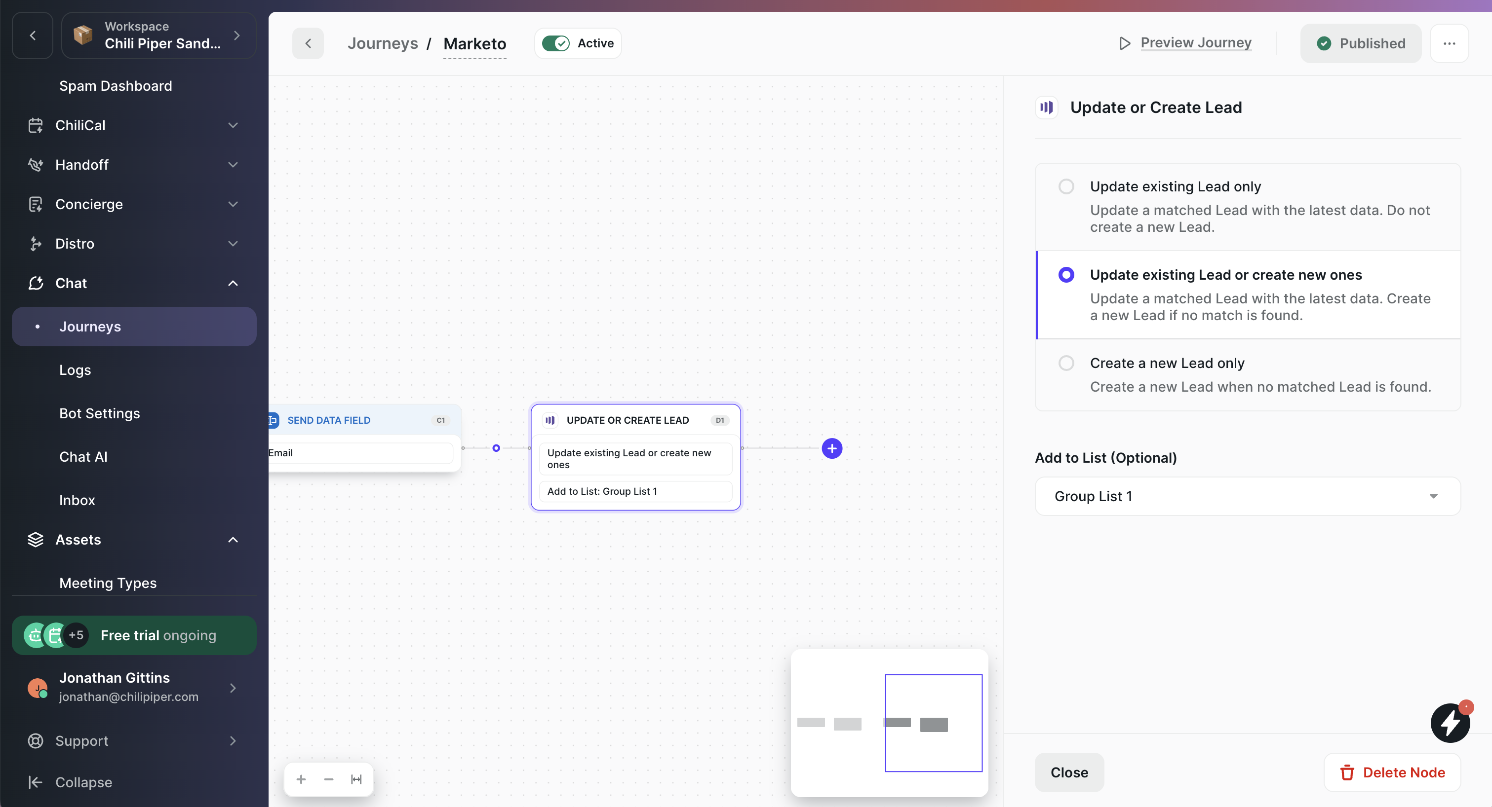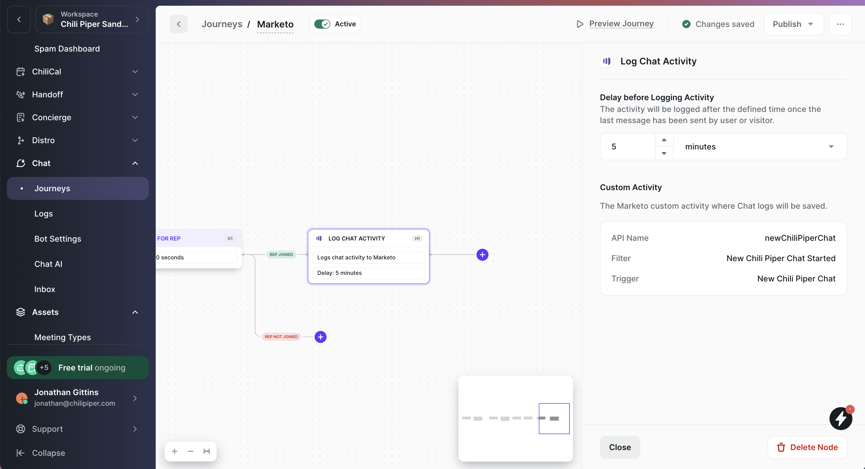 This node logs a New Chili Piper Chat custom activity on the Lead's Activity Log in Marketo.