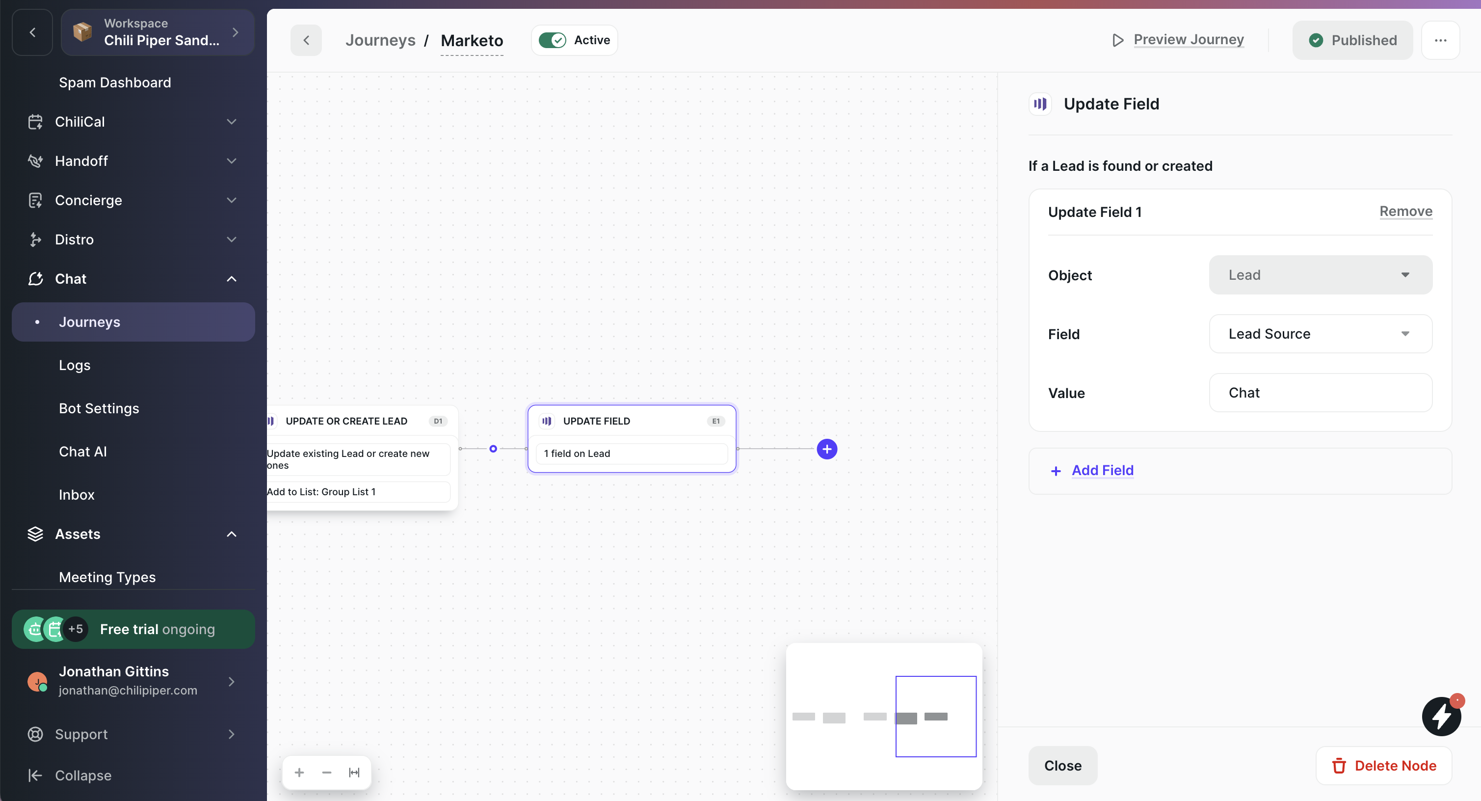 Note: Company fields are not yet available in the Update Field node. Currently, only Lead fields can be updated.