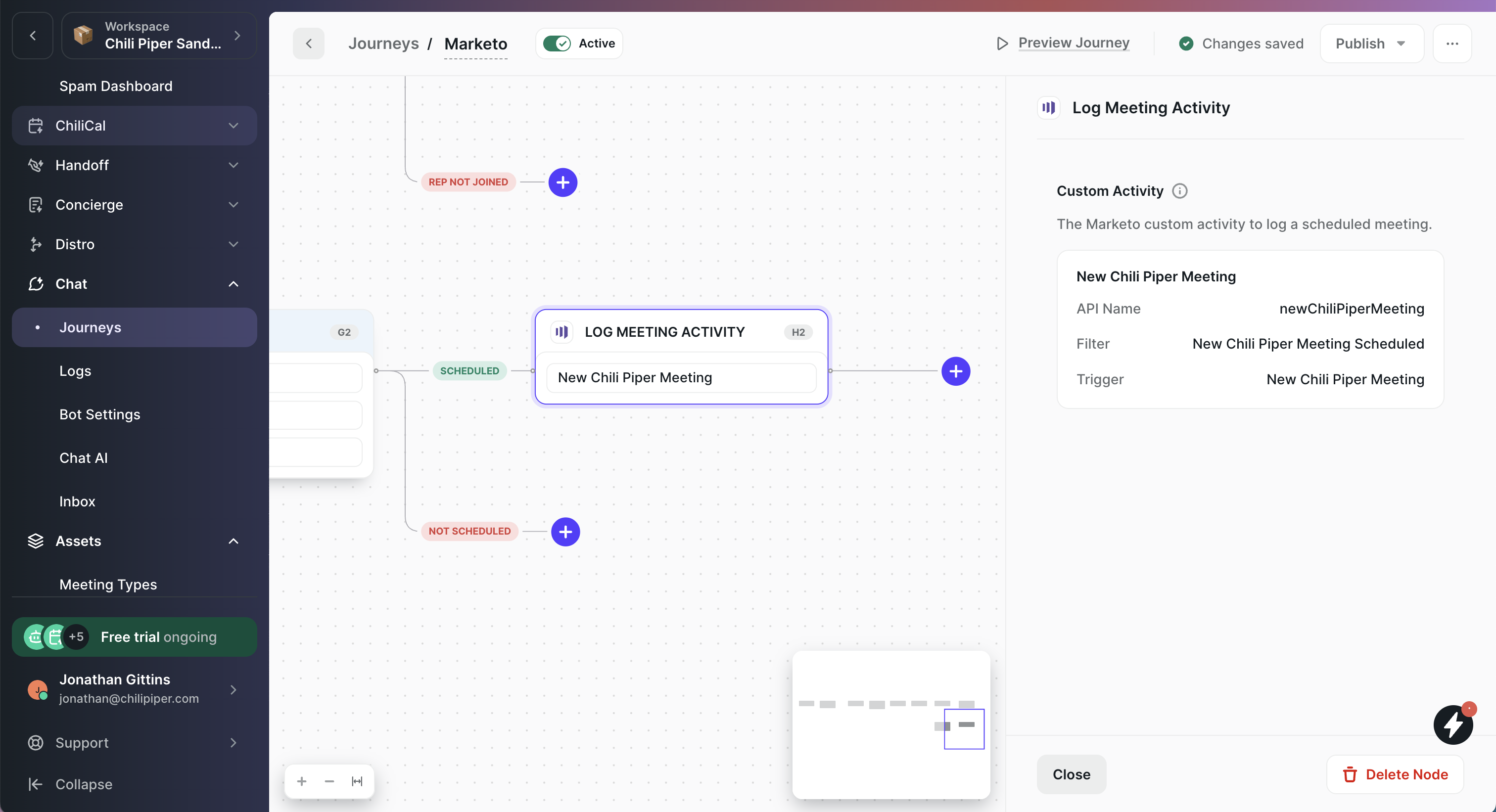 This node logs a New Chili Piper Meeting custom activity on the Lead's Activity Log in Marketo when a meeting is booked via Chat.