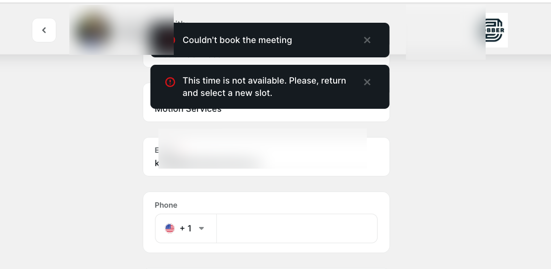 In some cases, the time slot appears available on the booking page, but the error occurs after the user attempts to confirm the meeting.