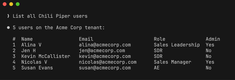 /mcp– the chili-piper server should appear in the list as connected. - Ask Claude: "What Chili Piper tenant is connected?" – Claude should return your organization name (e.g., "Acme Corp").